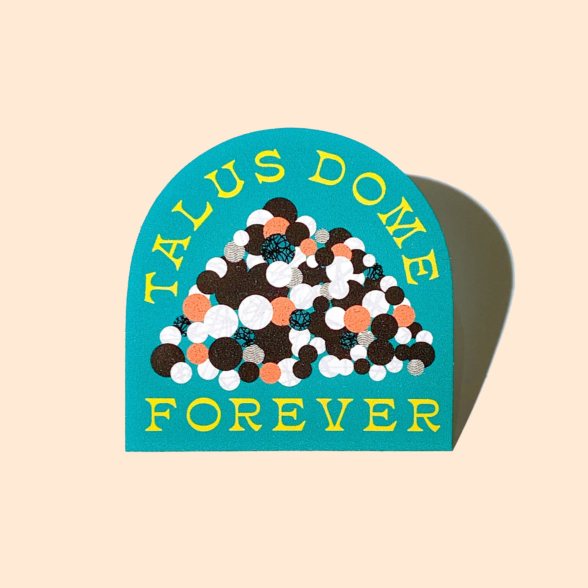 Oh beloved gleaming sculpture unceremoniously plunked on the hill next to a humungous roadway, how do we love thee? Let us count the ways. With this sticker we honour the shiny ways of the Talus Dome.